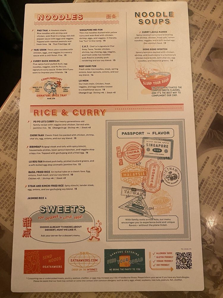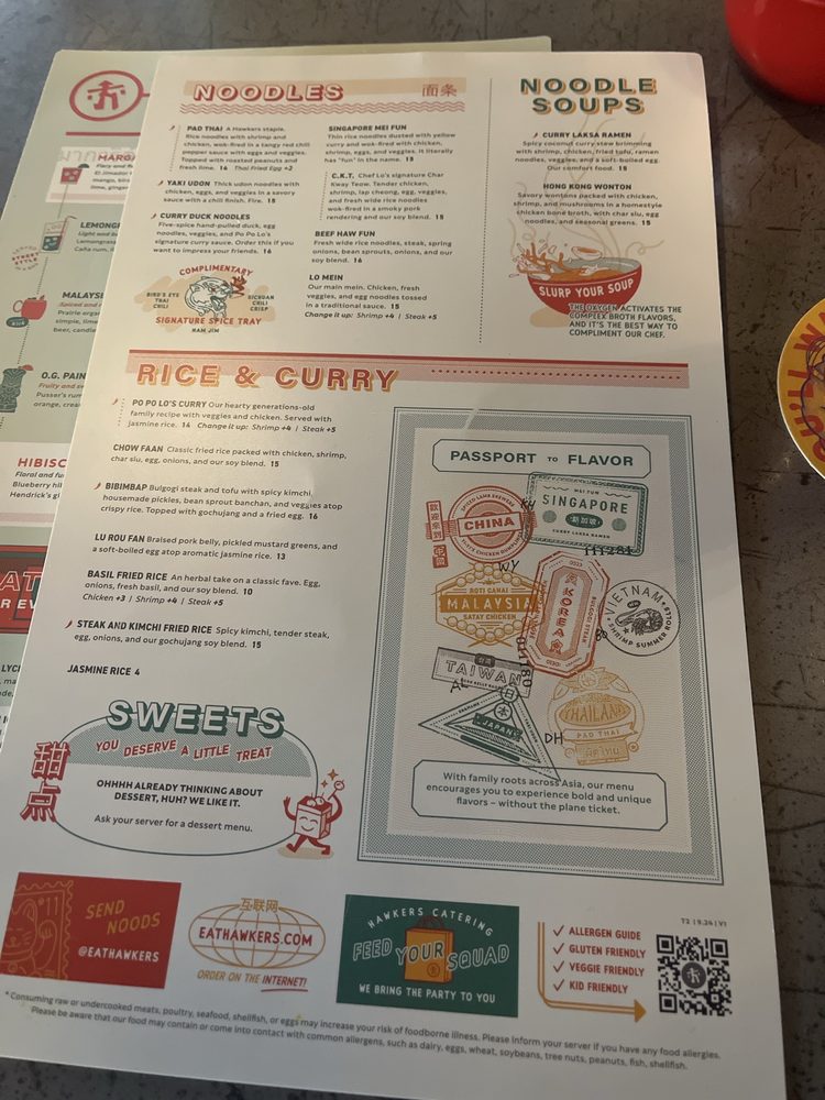A Hawkers staple. Rice noodles with shrimp and chicken, wok-fired in a tangy red chili pepper sauce with eggs and veggies. Topped with roasted peanuts and a squeeze of fresh lime.