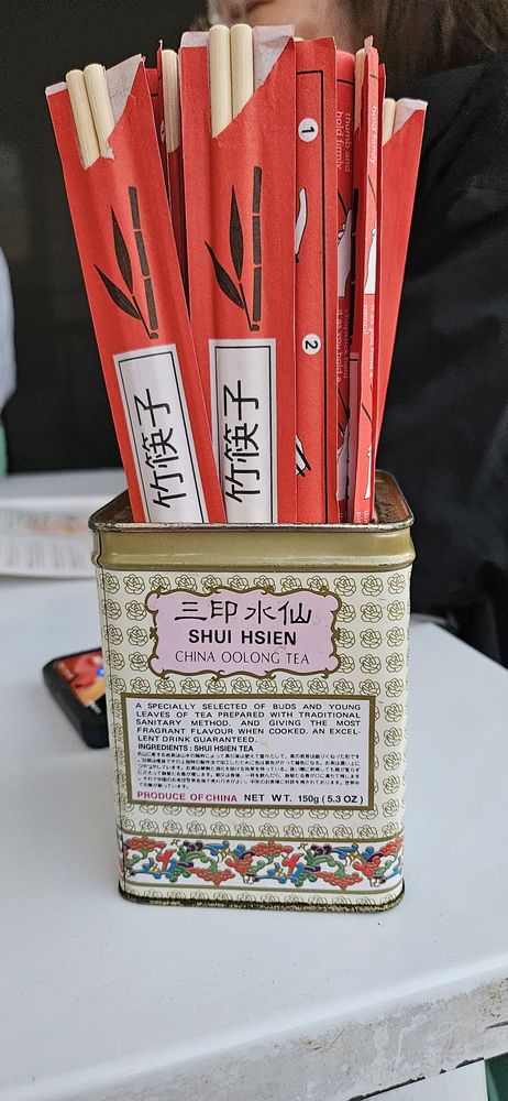 Egg noodle wrap, cabbage, carrots. Duck dipping sauce.